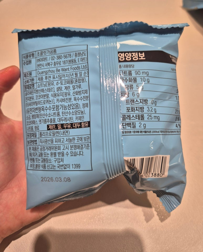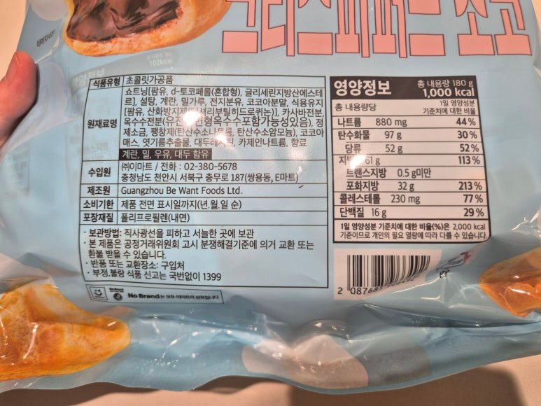 뒷면에는 원재료명, 영양정보 등 상품정보가 표기되어 있어요.